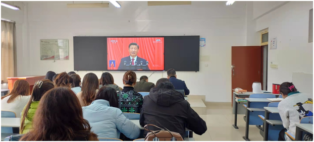 全体教职工在思贤楼507教室集体收看,部分员工代表在尚能楼318室集体收看,全院其他员工在宿舍线上收看。在近两小时的现场直播中,广大师生始终全神贯注,边聆听边思考边记录,真正融入到党的二十大盛会召开的热烈氛围中。