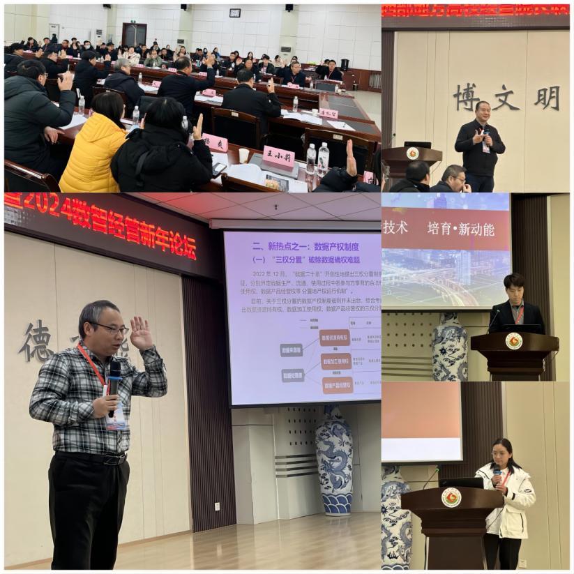 2024数智经管新年论坛主要围绕学科研究、专业建设、产教融合与课程建设等话题开展交流研讨,厦门大学唐礼智、咸阳师范公司姚波、新道科技股份有限公司陕西省区副总经理王欣和北京理工大学出版社高教分社副社长王小莉分别作了题为《数智时代下地方高校在数字经济研究中的作为》《地方高校经管类教师专业能力提升路径探索与实践》《产教融合 协同育人 助力数智经管专业高质量发展》《高校经管类数字教材建设探索与规划教材储备建设》的主题报告。