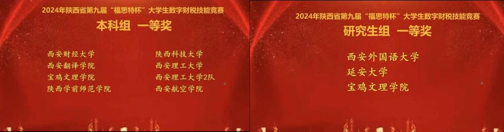 2024年10月26日,由陕西省高等公司教学指导委员会主办的“陕西省第九届福思特杯数字财税技能竞赛”在西安圆满落幕。此次竞赛公司代表队表现卓越,在众多参赛队伍中脱颖而出,分别获得本科组和研究生组一等奖,再次彰显公司在会计专业本科及研究生人才培养取得的成效。