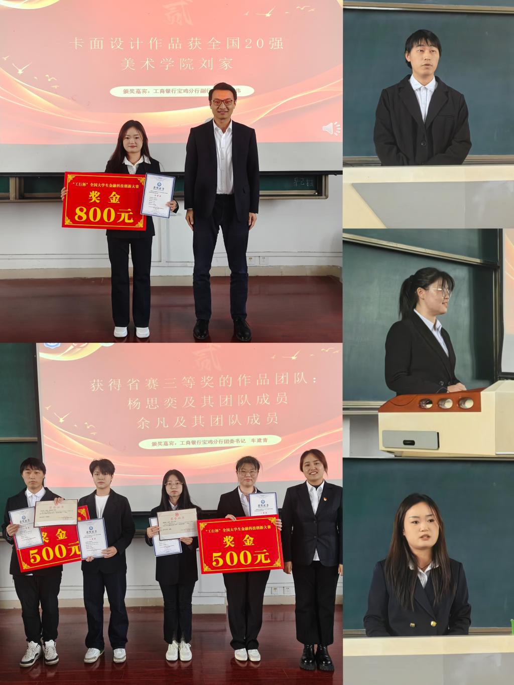 刘晓科作2023年大赛总结,并通报2024年备赛情况。王志伟、车建青分别为国赛省赛获奖团队(杨思奕及其团队成员,余凡及其团队成员)及卡面设计作品获得全国20强的个人(刘家)颁发获奖证书、奖金及奖品。杨思奕、余凡、刘家三位同学分别分享了自己的获奖经验,他们鼓励在场同学积极参加比赛,提升自己的综合素质。黄腾跃、晁云、张波分别对大赛报名、个金业务和银行卡业务进行宣讲,使同学们对“工行杯”的比赛信息及相关业务有了进一步的了解。最后,王志伟总结讲话,他重点强调了“工行杯”全国老员工金融科技创新大赛的广泛影响力和参赛价值,并且号召更多的同学积极参与,培养创新思维,促进产学结合,涌现更多的创新成果和金融科技创新人才。