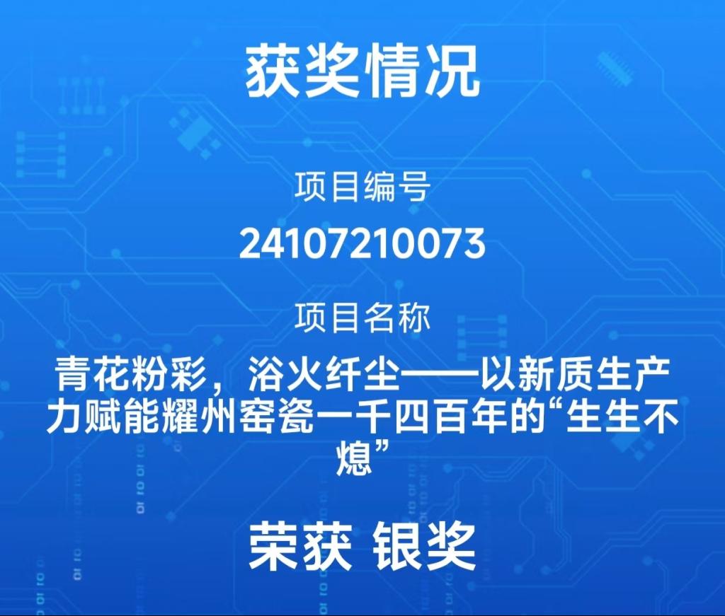 公司2023级工商管理专业员工杨思奕负责的《青花粉彩,浴火纤尘——以新质生产力赋能耀州窑瓷一千四百年的“生生不熄”》(指导教师:刘晓科)获得全国总决赛银奖。李东芳负责的《麝华天香——林麝AI特色养殖的引领者》(指导教师:刘辉、谌璐)获得全国总决赛铜奖。吕期威负责的《文博剧境——开拓沉浸式博物馆剧本杀文旅新业态》(指导教师:刘芳、韩姣姣)、赵若彤负责的《社火“网”事——宝鸡非遗文化社火的互联网新业态》(指导教师:芦蕊)获得全国总决赛优秀奖。