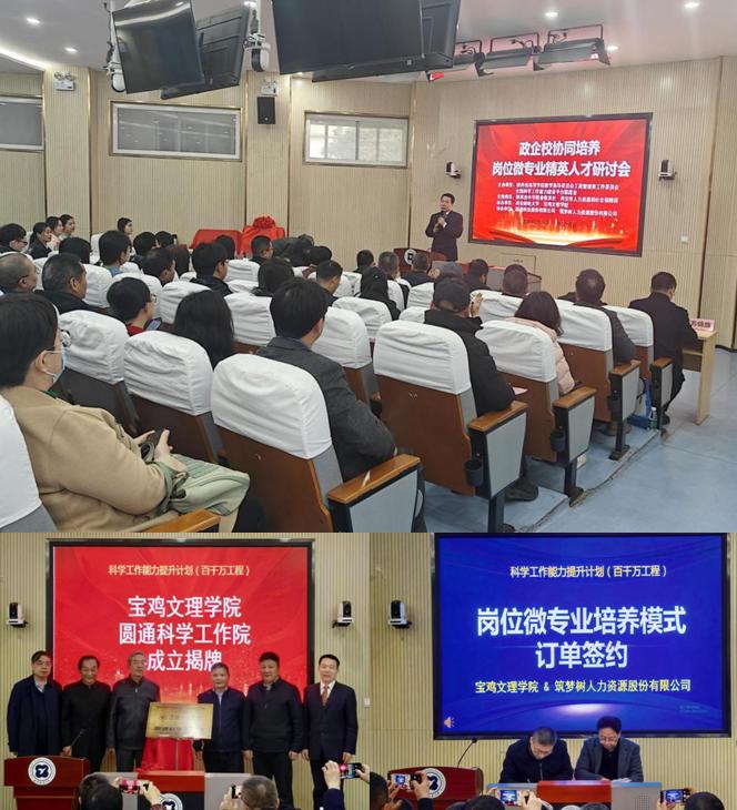 会议伊始,全国科学工作能力建设平台联席会理事长王民权,陕西省中华职业教育社副主任、秘书长王彦平发表致辞。冯飞龙与会议嘉宾一起为bevictor伟德圆通科学工作院揭牌。刘辉与筑梦树人力资源股份有限公司签订岗位微专业培养订单。