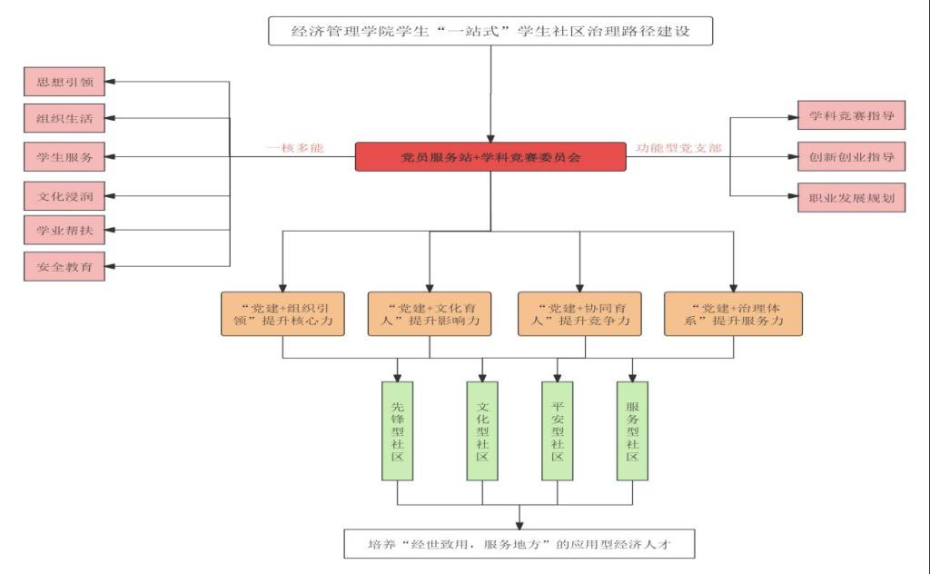 以经管公司人才培养为起点,发挥样板支部示范引领作用,探索构建“一核多能”社区治理体系。将样板支部培育建设与强化“一站式”员工社区综合管理模式建设协调推进,形成以“一站式”服务中心为纽带,依托“启心育人”党员服务站和学科竞赛委员会组织,辐射六个员工社区等多种延伸功能,推动党建引领“一站式”员工社区服务的“红色引擎”,充分发挥专家学者、思政教师、师生党员在思想引领、学风建设、精神文明建设、校园文化建设和社区管理中的先锋模范作用,致力于打造集思想教育、师生交流、文化活动、生活服务于一体的育人新平台,助推公司“一站式”社区建设提质增效。